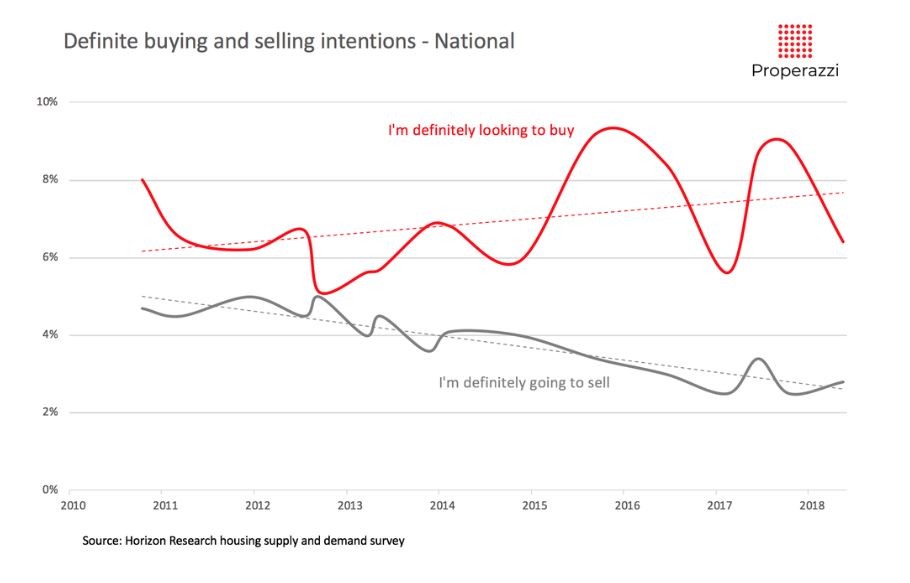 However Alister Helm**, of Properazzi, interprets the data slightly differently in his article released June 6 – “Wow – 6.4% of adults definitely going to buy; but only 2.8% going to sell! As stated that would seem to be a “serious shortage of properties for keen buyers”.